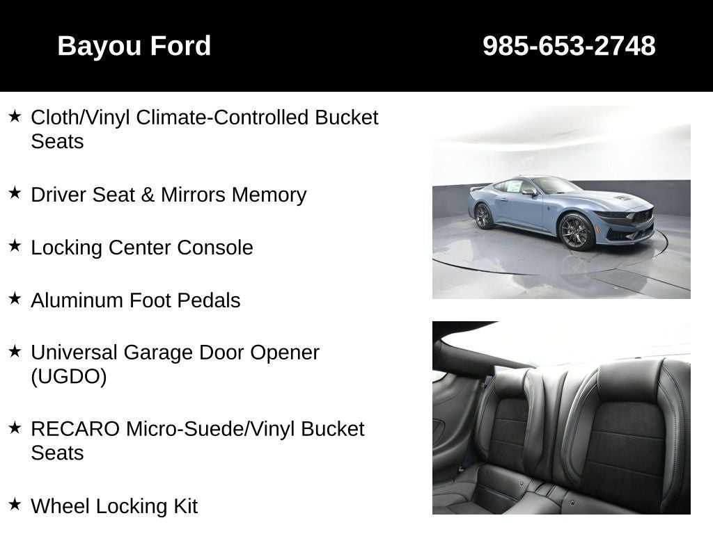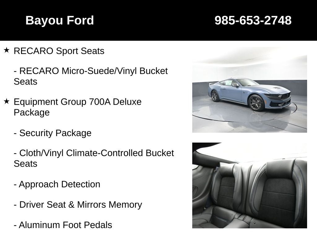 Mustang Dark Horse 700A, 2D Coupe, 5.0L V8 DOHC 32V, 10-Speed Automatic, RWD, Vapor Blue Metallic, Black w/Blue Accents w/RECARO Micro-Suede/Vinyl Bucket Seats, Active Anti-Theft System, Aluminum Foot Pedals, Approach Detection, Cloth/Vinyl Climate-Controlled Bucket Seats, Driver Seat & Mirrors Memory, Equipment Group 700A Deluxe Package, Locking Center Console, Navigation system: Connected Navigation, RECARO Micro-Suede/Vinyl Bucket Seats, RECARO Sport Seats, Security Package, Universal Garage Door Opener (UGDO), Wheel Locking Kit.