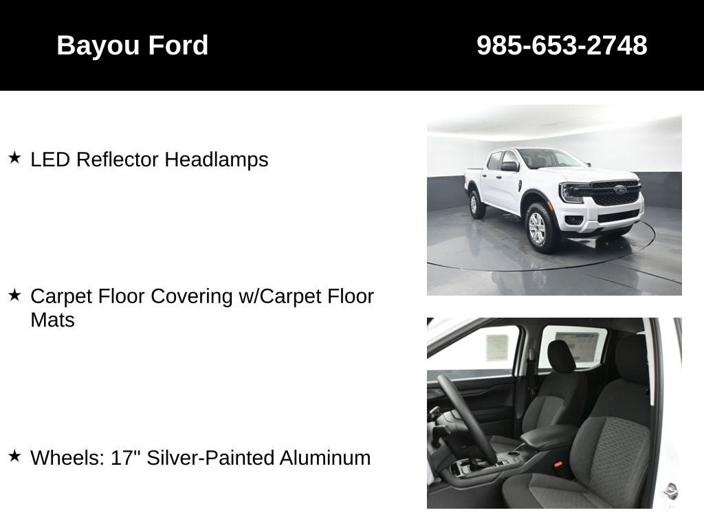 Ranger XL 100A, 4D Crew Cab, EcoBoost 2.3L I4 GTDi DOHC Turbocharged VCT, 10-Speed Automatic, RWD, Oxford White, Ebony w/Cloth Front Bucket Seats or Cloth Front Heated Bucket Seats, Carpet Floor Covering w/Carpet Floor Mats, Equipment Group 100A Standard, Halogen Fog Lamps, LED Reflector Headlamps, STX Appearance Package, STX Fender Badge, Wheels: 17 Silver-Painted Aluminum.