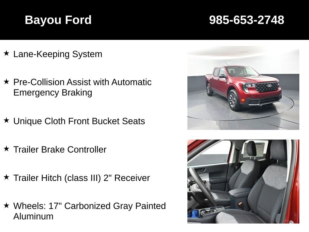 Maverick XLT 302A, 4D Crew Cab, EcoBoost 2.0L I4 GTDi DOHC Turbocharged VCT, 8-Speed Automatic, AWD, Ruby Red Metallic Tinted Clearcoat, Navy Pier/Aspen Gray w/Unique Cloth Front Bucket Seats, 4K Tow Package, Auto High Beams, BLIS with Cross-Traffic Alert and Trailer Coverage, Equipment Group 302A, Exit Warning, Ford Co-Pilot360, Ford Connectivity Package (1-Year Included), Intersection Assist, Lane-Keeping System, Power Glass Manual-Folding Mirrors, Pre-Collision Assist with Automatic Emergency Braking, Radio: AM/FM Stereo with 6 Speakers, Rear Cross Traffic Braking, Rear Parking Sensors, Rear-View Camera, SiriusXM with 360L, SYNC 4 with Enhanced Voice Recognition, Trailer Brake Controller, Trailer Hitch (class III) 2 Receiver, Unique Cloth Front Bucket Seats, Upgraded Cooling Fan, Wheels: 17 Carbonized Gray Painted Aluminum.