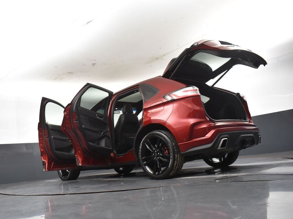 This Edge ST also boasts a stunning Ruby Red Metallic Tinted Clearcoat exterior, complemented by the premium Gloss Black-Painted 21-inch aluminum wheels and Colorado Red brake calipers. The interior features Leather-Trimmed Heated ST Bolstered Bucket Seats, as well as Cooled Front Seats and Heated Rear Seats for maximum comfort.