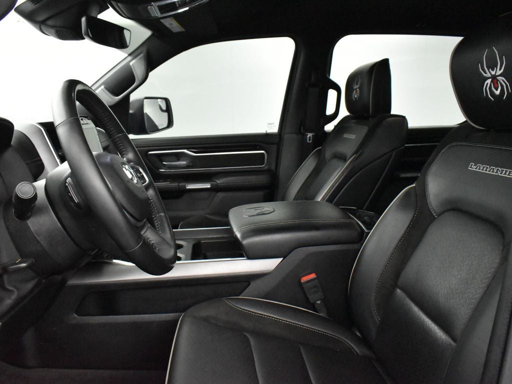 1500 Laramie SCA Black Widow, 4D Crew Cab, HEMI 5.7L V8 Multi Displacement VVT, 8-Speed Automatic, 4WD, Diamond Black Crystal Pearlcoat, Black Leather, #1 Seat Foam Cushion, 10 Speakers, 12 Touchscreen Display, 3 Rear Seat Head Restraints, 4 Way Front Headrests, 4-Wheel Disc Brakes, 4G LTE Wi-Fi Hot Spot, ABS brakes, All Plant-Installed Decals, All R1 High Radios, All Radio Equipped Vehicles, Alloy wheels, Anti-Spin Differential Rear Axle, Apple CarPlay/Android Auto, Auto High Beam Headlamp Control, Auto-Dimming Exterior Driver Mirror, Black Interior Accents, Body Color Door Handles, Body Color Exterior Mirrors, Body Color Front Bumper, Body Color Premium Power Mirrors, Body Color Rear Bumper w/Step Pads, Bucket Seats, Connected Travel & Traffic Services, Connectivity - US/Canada, Convex Wide-Angle Mirror Insert, Delete LED Lamp - Floor Console Bin, Disassociated Touchscreen Display, Driver Seat Memory, Dual front impact airbags, Dual front side impact airbags, Exterior Mirrors Courtesy Lamps, Exterior Mirrors w/Heating Element, Exterior Mirrors w/Memory, Exterior Mirrors w/Supplemental Signals, Foam Bottle Insert (Door Trim Panel), For Details, Visit DriveUconnect.com, For More Info, Call 800-643-2112, Front fog lights, Front Seat Back Map Pockets, Full Length Upgraded Floor Console, Global Telematics Box Module (TBM), Google Android Auto, GPS Antenna Input, GPS Navigation, Grille Surround 3 Body Color Tex 2 Black, HD Radio, Heated Front Seats, Heated Steering Wheel, Integrated Center Stack Radio, Integrated Voice Command w/Bluetooth®, Laramie Level A Equipment Group (DISC), Leather steering wheel, Leather Trimmed Bucket Seats, Low tire pressure warning, Outside temperature display, Panic alarm, ParkSense Front/Rear Park Assist w/Stop, ParkView Rear Back-Up Camera, Power 2-Way Driver Lumbar Adjust, Power 2-Way Passenger Lumbar Adjust, Power 8-Way Driver & Passenger Seats, Power-Folding Mirrors, Quick Order Package 25H Laramie, Radio: Uconnect 5 Nav w/12.0 Display, Rain Sensitive Windshield Wipers, Rear 60/40 Folding Seat, Rear 60/40 Folding Split Recline Seat, Remote Tailgate Release, SiriusXM Radio Service, SiriusXM w/360L, Speed control, Sport Appearance Package, Sport Decal, Sport Performance Hood, Tilt steering wheel, Trailer Brake Control, Twill Film Appliques, USB Host Flip, Ventilated Front Seats, Wheels: 20 x 9 Premium Painted w/Inserts.
