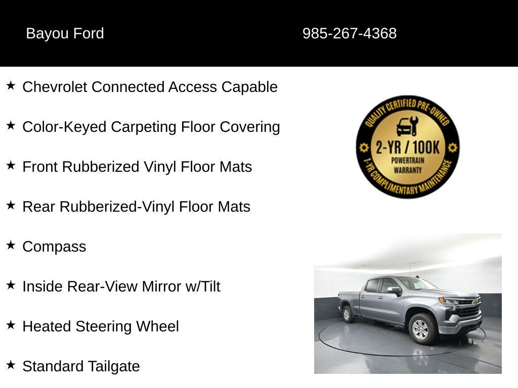 Silverado 1500 LT, 4D Crew Cab, EcoTec3 5.3L V8, 10-Speed Automatic, 4WD, Sterling Gray Metallic, Jet Black w/Cloth Seat Trim, 10-Way Power Driver Seat w/Lumbar, 12.3 Multicolor Reconfigurable Digital Display, 120-Volt Bed Mounted Power Outlet, 120-Volt Instrument Panel Power Outlet, 220 Amp Alternator, All-Star Edition, Auto High-beam Headlights, Auto-Locking Rear Differential, Bluetooth® For Phone, Brake assist, Chevrolet Connected Access Capable, Chrome Mirror Caps, Color-Keyed Carpeting Floor Covering, Compass, Convenience Package, Deep-Tinted Glass, Delay-off headlights, Dual Rear USB Ports (Charge Only), Dual-Zone Automatic Climate Control, Electric Rear-Window Defogger, Electrical Steering Column Lock, Electronic Cruise Control, Electronic Stability Control, EZ Lift Power Lock & Release Tailgate, Front Frame-Mounted Black Recovery Hooks, Front Rubberized Vinyl Floor Mats, Fully automatic headlights, HD Rear Vision Camera, Heated Driver & Front Outboard Passenger Seats, Heated Power-Adjustable Outside Mirrors, Heated Steering Wheel, Hitch Guidance, Inside Rear-View Mirror w/Tilt, Keyless Open & Start, LED Cargo Area Lighting, OnStar & Chevrolet Connected Services Capable, Panic alarm, Power door mirrors, Power Front Windows w/Driver Express Up/Down, Power Front Windows w/Passenger Express Down, Power Rear Windows w/Express Down, Preferred Equipment Group 1LT, Rear 60/40 Folding Bench Seat (Folds Up), Rear Rubberized-Vinyl Floor Mats, Rear step bumper, Remote Start Package, Remote Vehicle Starter System, Security system, SiriusXM w/360L, Speed control, Standard Tailgate, Steering Wheel Audio Controls, Theft Deterrent System (Unauthorized Entry), Trailering Package, Wi-Fi Hot Spot Capable, Wireless Phone Projection, Wrapped Steering Wheel.