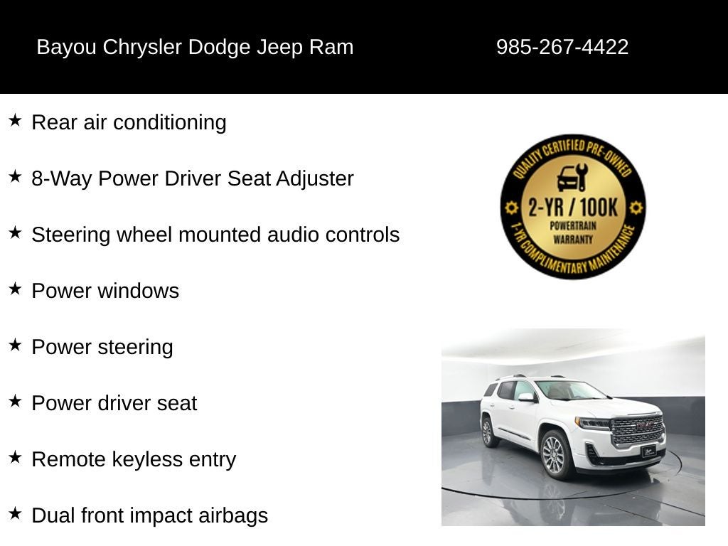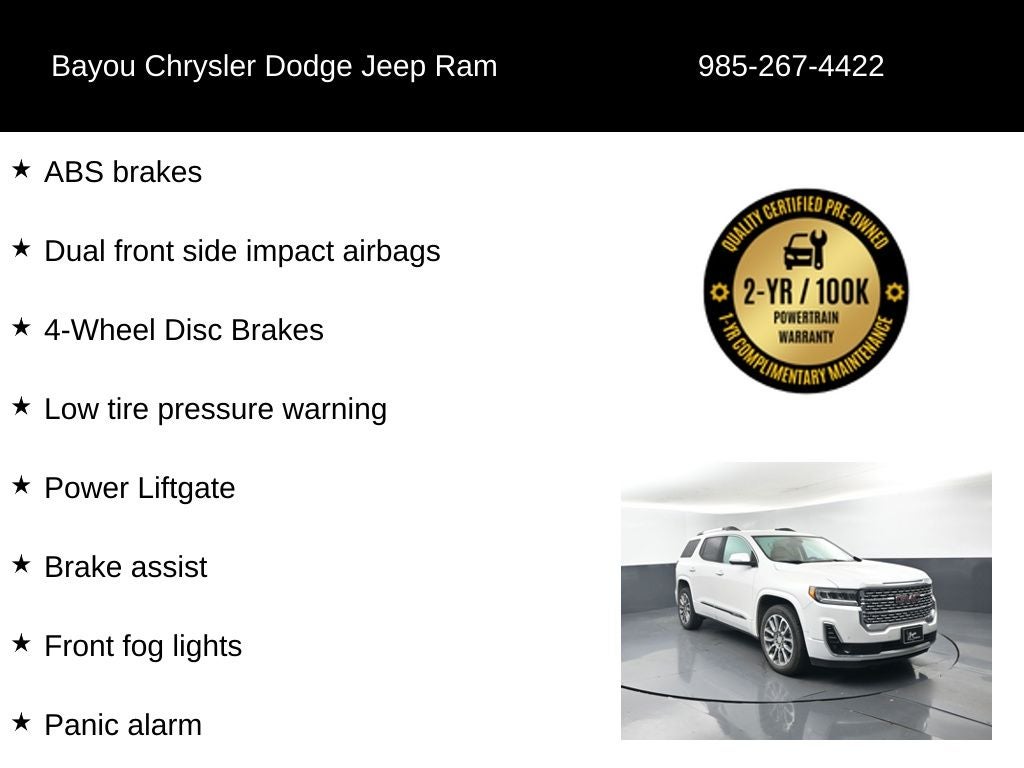 Acadia Denali, 4D Sport Utility, 3.6L V6 SIDI, 9-Speed Automatic, FWD, White Frost Tricoat, Dark Galvanized/Light Shale Leather, 20 Ultra Bright Machined Aluminum Wheels, 4-Wheel Disc Brakes, 8 Speakers, 8-Way Power Driver Seat Adjuster, ABS brakes, Adaptive Cruise Control, Air Conditioning, Alloy wheels, Apple CarPlay/Android Auto, Bose Premium 8-Speaker Audio System Feature, Brake assist, Compass, Denali Technology Package, Dual front impact airbags, Dual front side impact airbags, Enhanced Automatic Emergency Braking, Front fog lights, HD Surround Vision, Heated & Ventilated Driver & Front Passenger Seats, Heated door mirrors, Heated steering wheel, Low tire pressure warning, Navigation System, Outside temperature display, Panic alarm, Power Driver Lumbar Control Seat Adjuster, Power driver seat, Power Liftgate, Power passenger seat, Power steering, Power windows, Preferred Equipment Group 5SA, Radio: AM/FM 8 Diagonal Multi-Touch Navigation, Rear air conditioning, Rear Camera Mirror, Rear Camera Mirror Washer, Remote keyless entry, Security system, SiriusXM w/360L, Steering wheel mounted audio controls, Tilt steering wheel, Wireless Apple CarPlay/Wireless Android Auto.